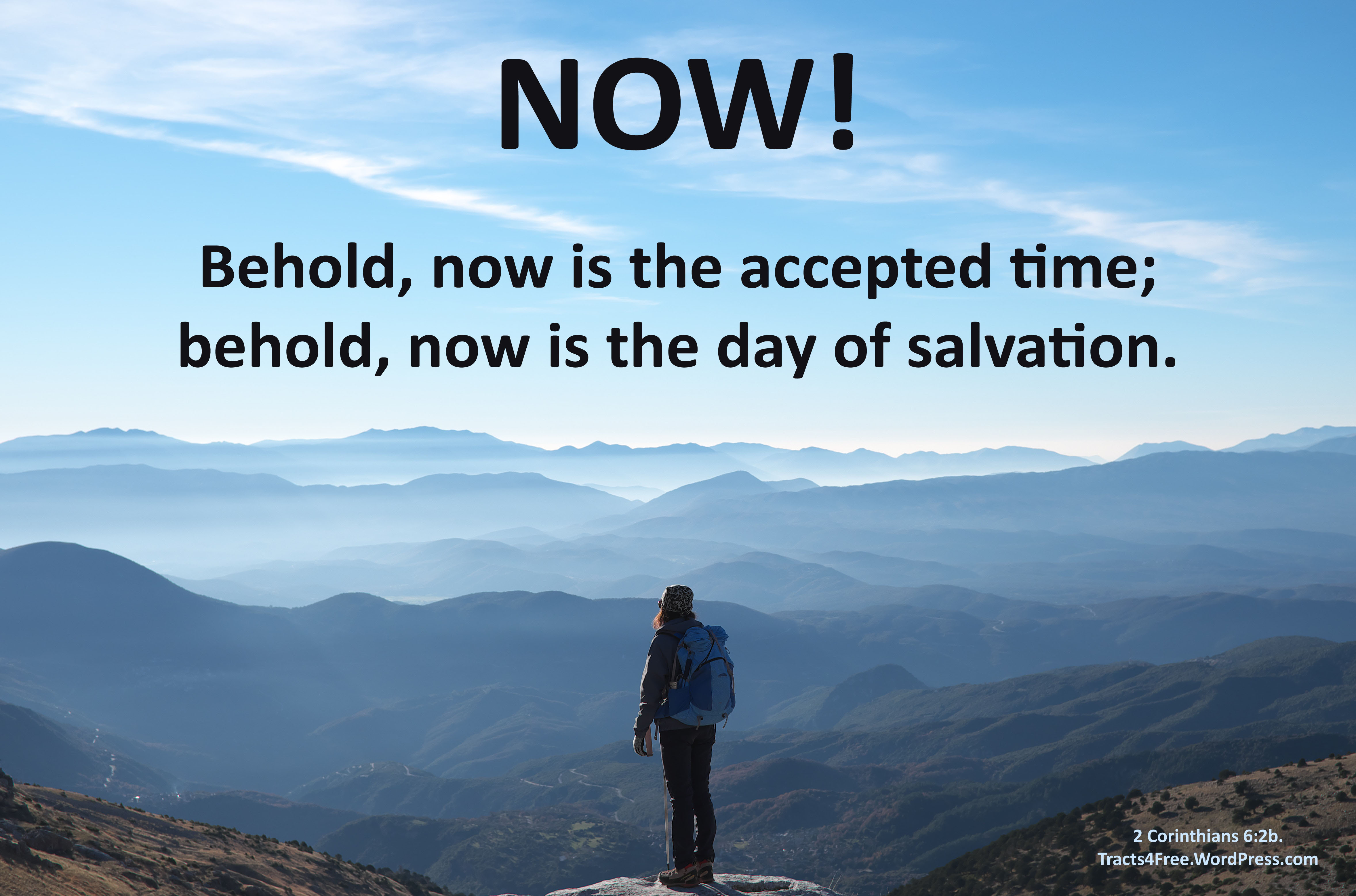 Now is the day of salvation Christian poster. 2 Corinthians 6:2b. Photo: Andreas Chu on unsplash.com. Poster: David Clode.