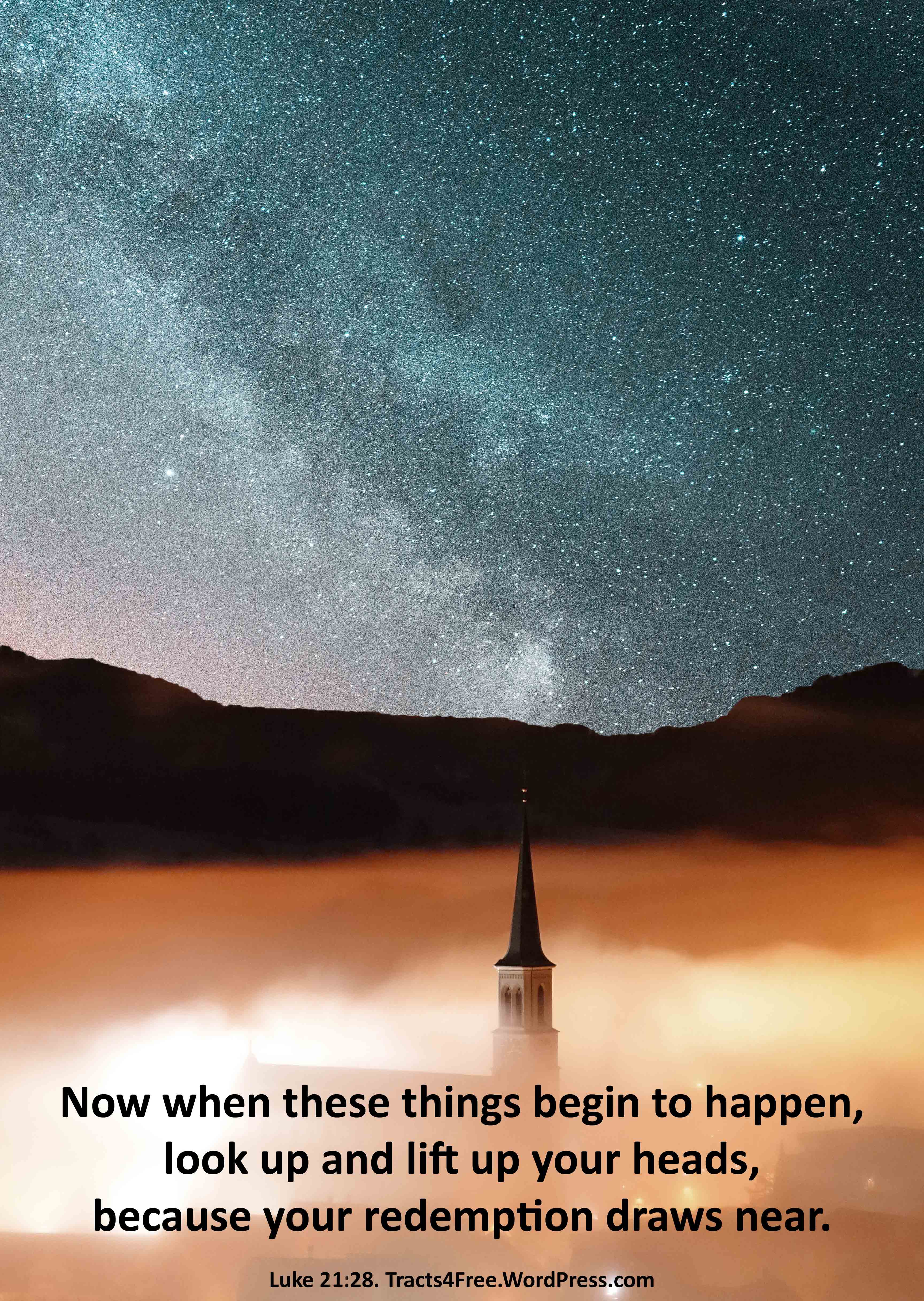 Look up Christian poster. Luke 21:28. Photo: Martin Sattler on unsplash.com. Poster: David Clode.